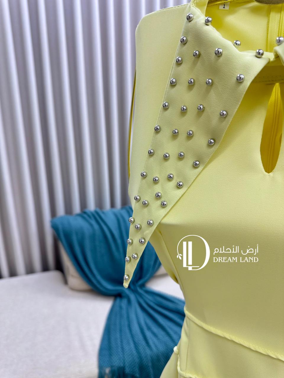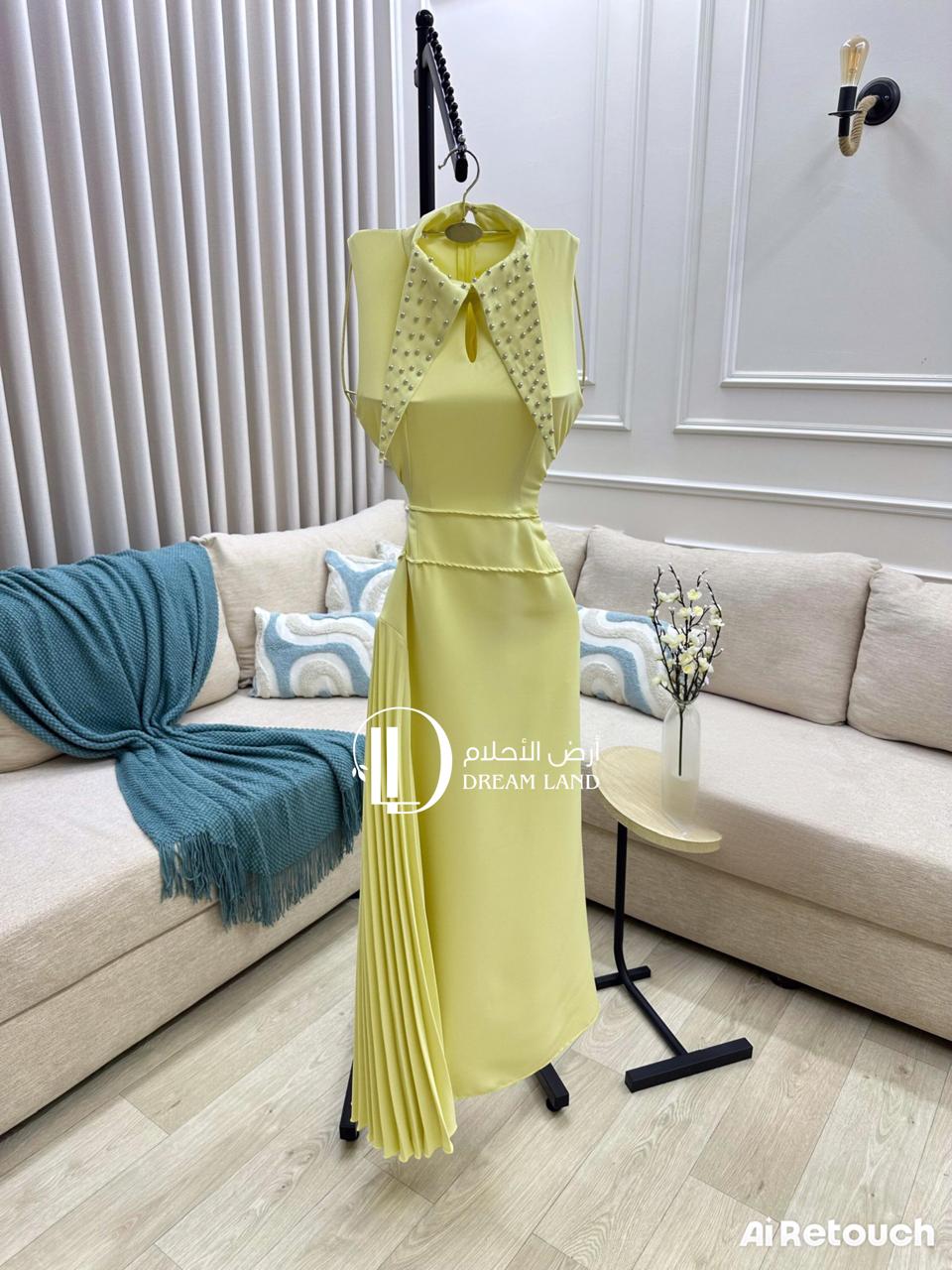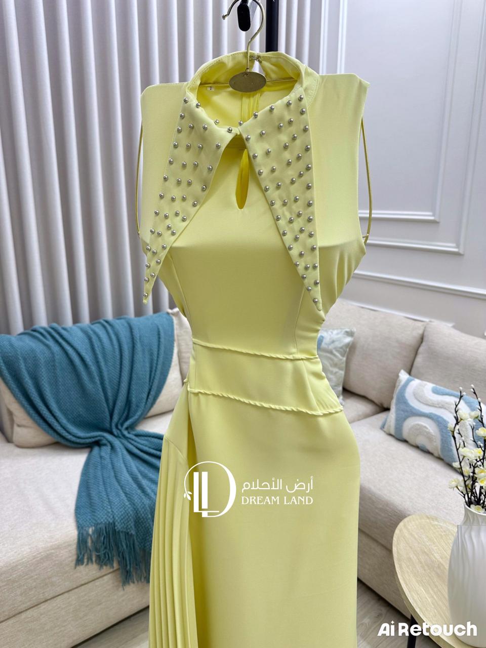 كوني أيقونة الأناقة العصرية مع هذا الفستان الأصفر. يتميز بتصميمه الفريد الذي يجمع بين ياقة مطرزة بتفاصيل لامعة، وقصة أنيقةبخصر محدد. كما تضيف الكسرات الجانبية لمسة من الدراما والحركة على الإطلالة. هذا الفستان هو الخيار الأمثل للمناسبات النهارية، وحفلات الغداء، أو أي احتفال يتطلب إطلالة عصرية ومختلفة.