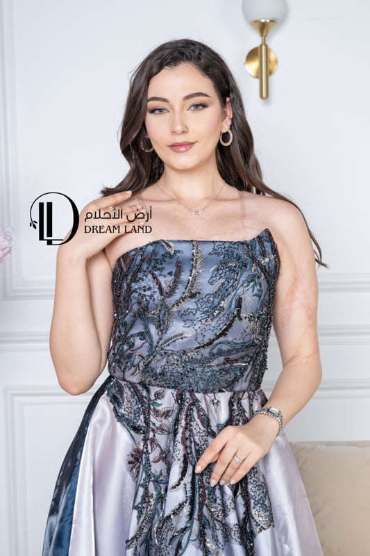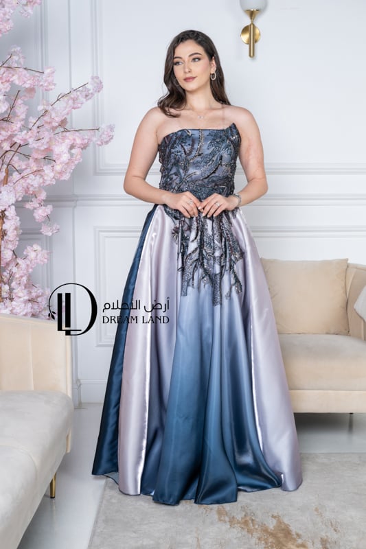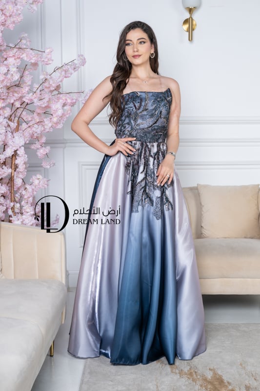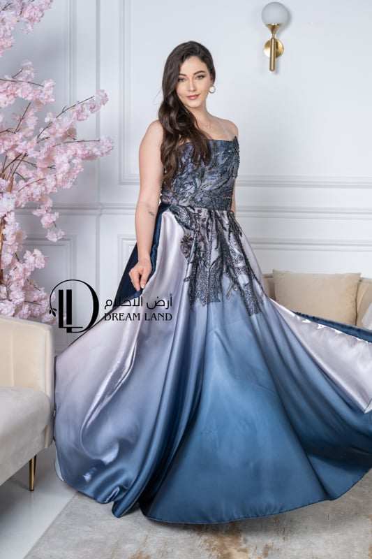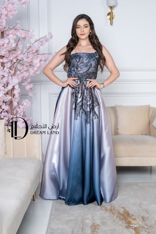 كوني أيقونة الأناقة والتميز مع هذا الفستان السهرة الأزرق الساحر. يتميز بتصميمه الذي يجمع بين صدريّة أنيقة مزينة بتطريز فاخر، وتنورة واسعة بقصة أميرات بلون متدرج (أومبري) يمنحك حضوراً ملكياً. هذا الفستان هو الخيار الأمثل للمناسبات الرسمية، وحفلات الزفاف، أو أي احتفال يتطلب إطلالة جذابة وراقية.