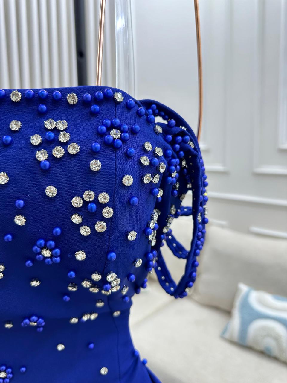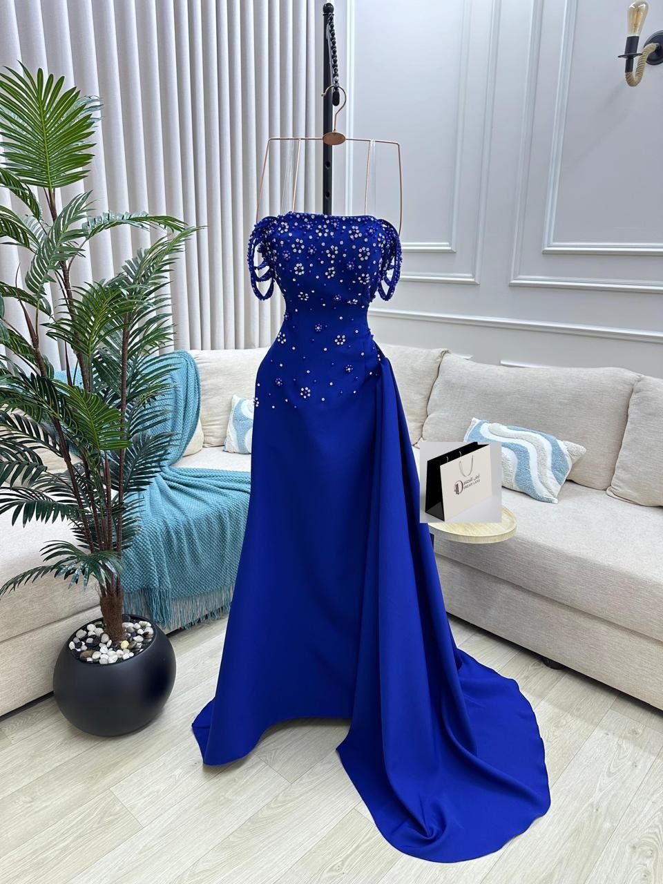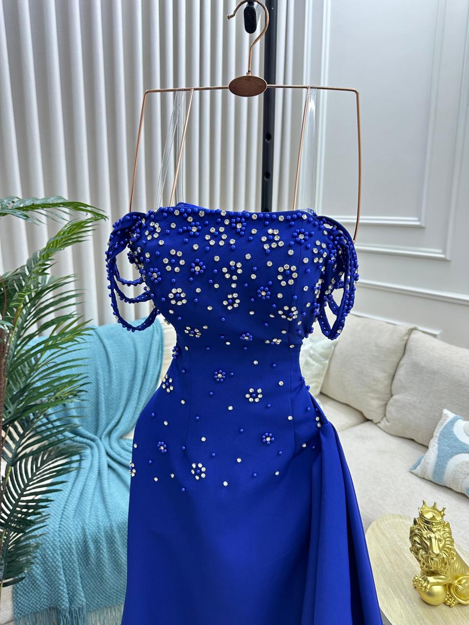 تألقي بإطلالة ملكية مع هذا الفستان السهرة الأزرق الملكي. يتميز بتصميمه الذي يجمع بين صدريّة أنيقة مزينة بتطريز كريستالي فاخر، وأشرطة منسدلة تضفي لمسة من الأنوثة والجمال. كما ينساب ذيل جانبي من نفس القماش ليمنحك مظهراً فاخراً. هذا الفستان هو الخيار الأمثل للمناسبات الرسمية، وحفلات الزفاف، أو أي احتفال يتطلب إطلالة لا تُنسى.
