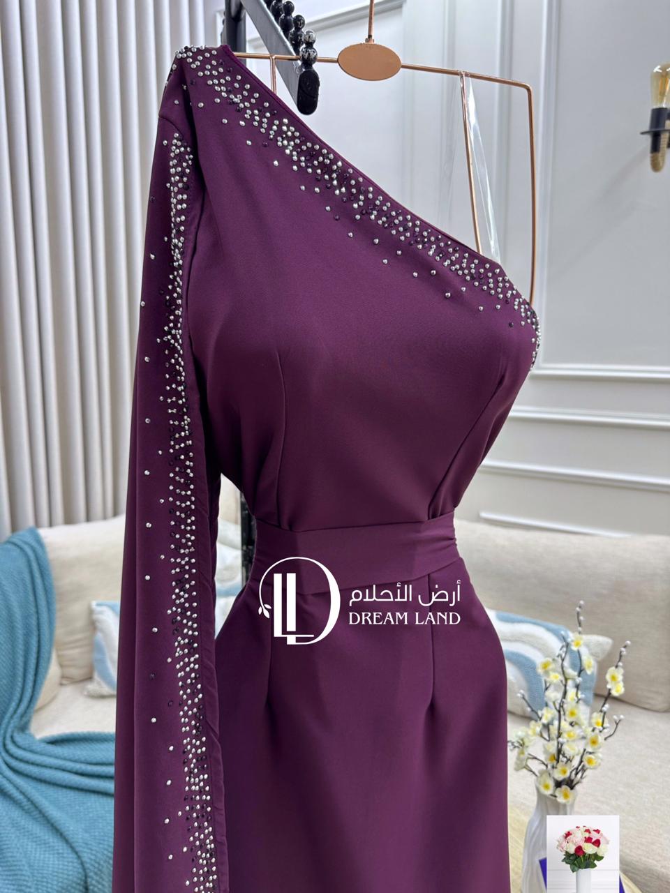 تألقي بإطلالة لا تُنسى مع هذا الفستان السهرة البنفسجي الساحر. يتميز بتصميمه الذي يجمع بين قصة بكتف واحد جذابة، ووشاح منسدلمن الكتف مزين بتطريز فاخر ينساب بأناقة على القوام. هذا الفستان هو الخيار الأمثل للمناسبات الرسمية، وحفلات الزفاف، أو أي احتفال يتطلب إطلالة تجمع بين الفخامة والجاذبية.