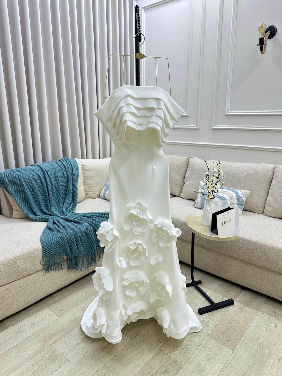- التفاصيل: طبقات قماشية مطوية على الصدر، وورود كبيرة بارزة على التنورة.