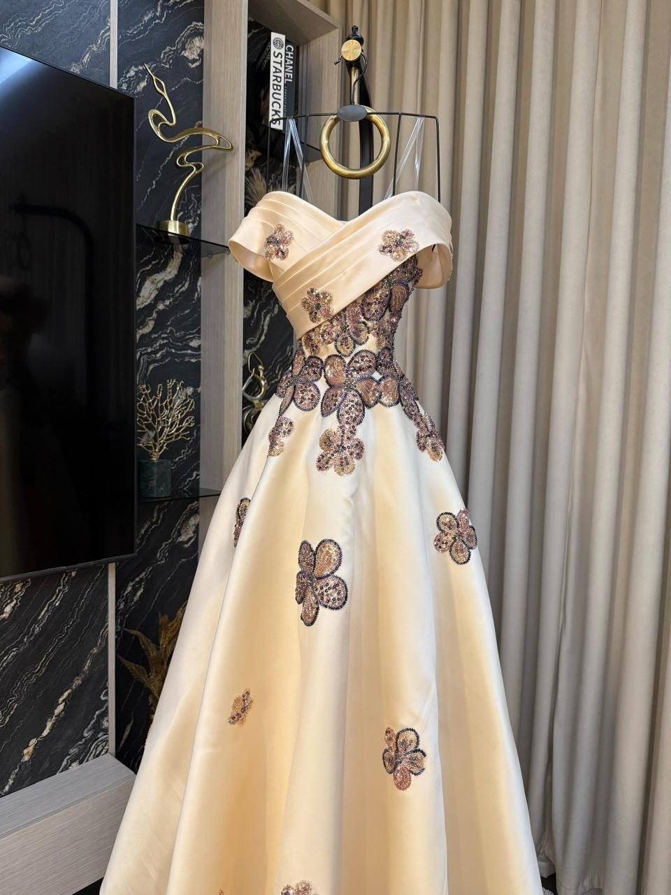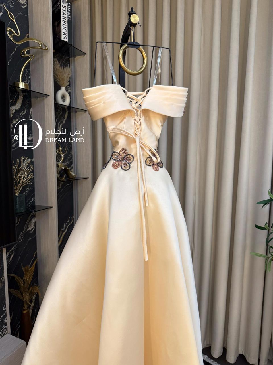 كوني أميرة السهرة مع هذا الفستان السهرة البيج الفاتح الساحر. يتميز بتصميمه الذي يجمع بين قصة أميرات وصدريّة أنيقة بأكتاف منسدلة، وتطريز ورود فاخر يغطي الفستان بالكامل. يبرز التصميم جمال القوام، ويكمله قماش الساتان اللامع الذي يمنحك حضوراً واثقاً وجذاباً. هذا الفستان هو الخيار الأمثل للمناسبات الرسمية، وحفلات الزفاف، أو أي احتفال يتطلب إطلالة ملكية.