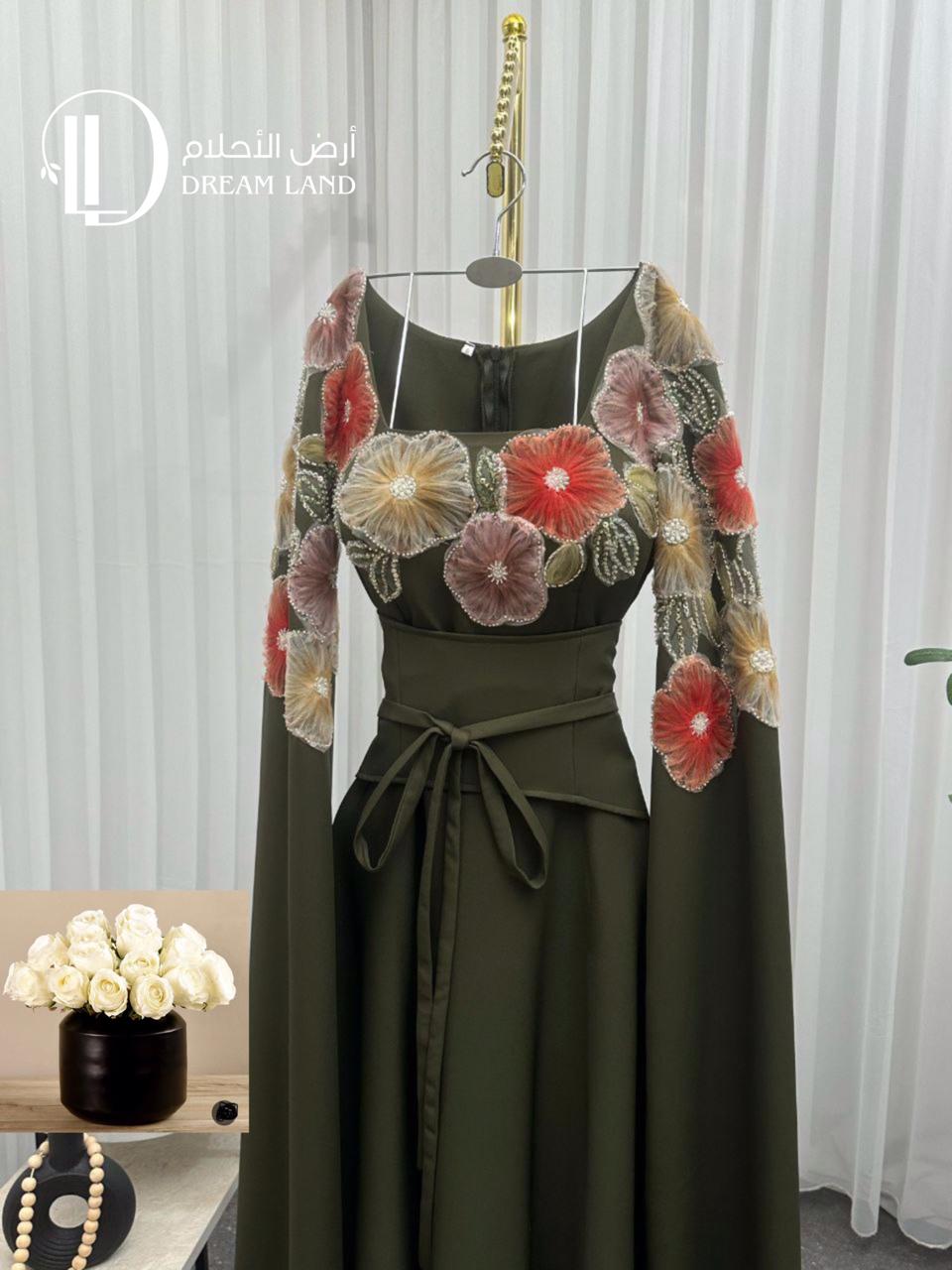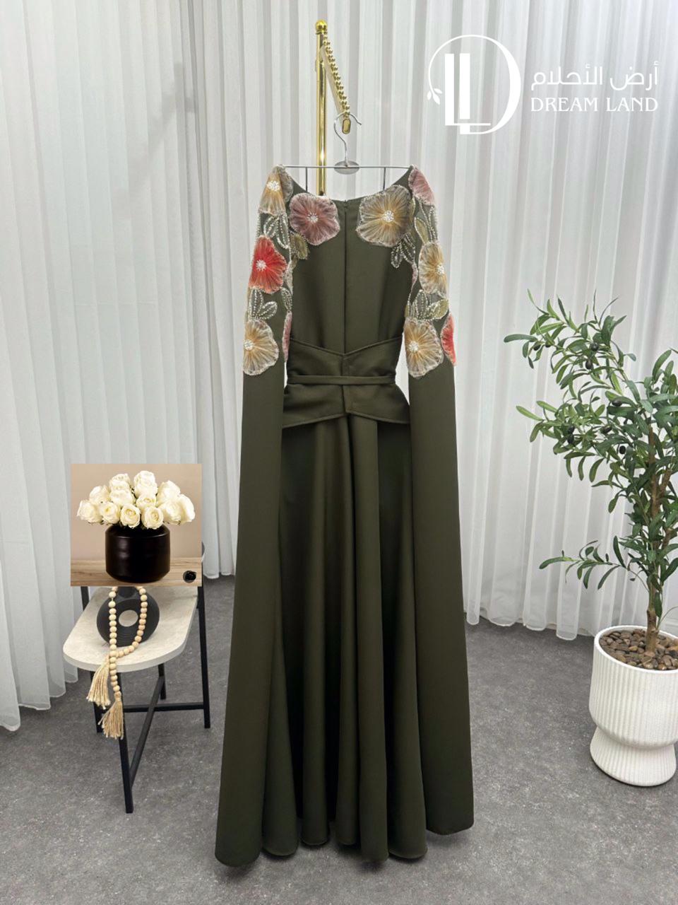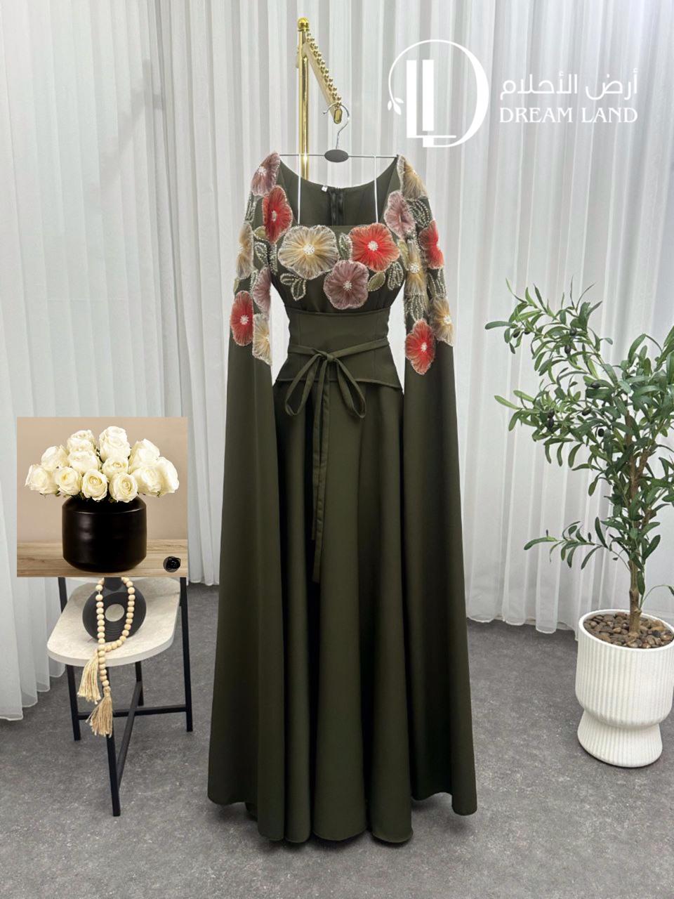 كوني أيقونة الأناقة والتميز مع هذا الفستان السهرة الزيتي الساحر. يتميز بتصميمه الذي يجمع بين صدريّة أنيقة مزينة بتطريز ورود ملونةعلى الصدر والأكمام، وأكمام درامية تنسدل على شكل كيب لتمنحك حضوراً ملكياً. هذا الفستان هو الخيار الأمثل للمناسبات الرسمية، وحفلات الزفاف، أو أي احتفال يتطلب إطلالة جذابة وراقية.
