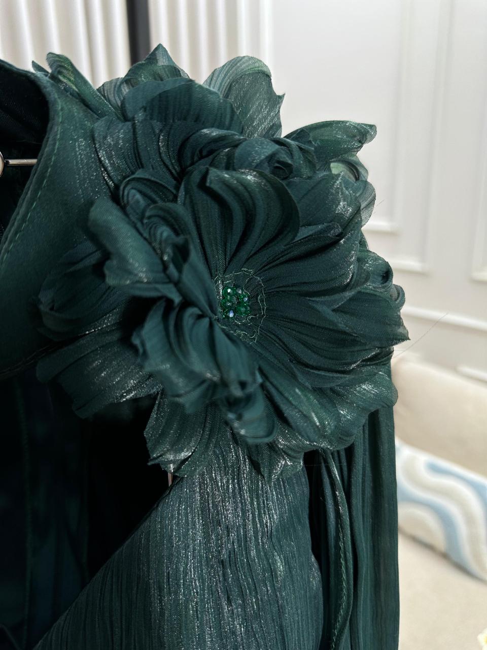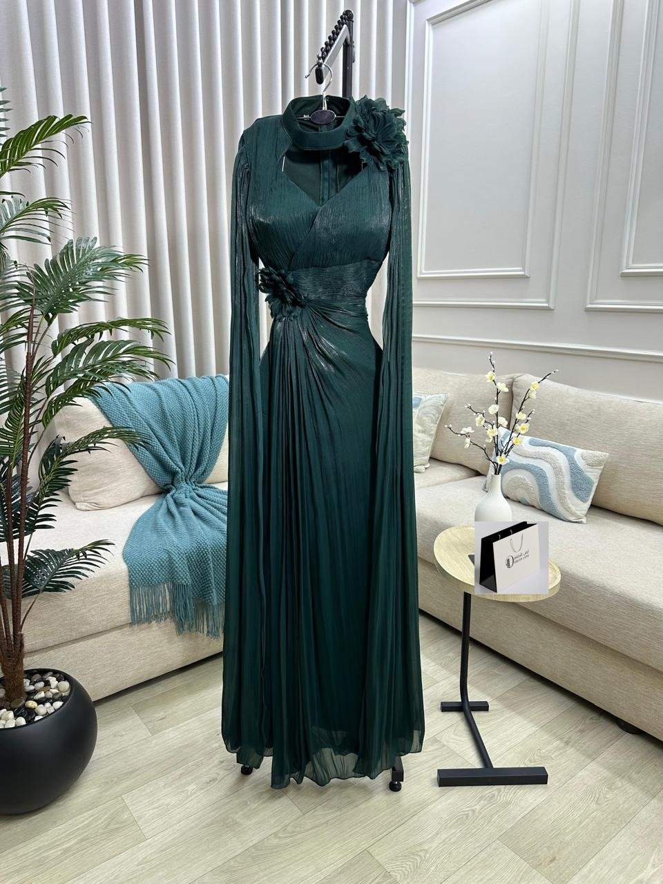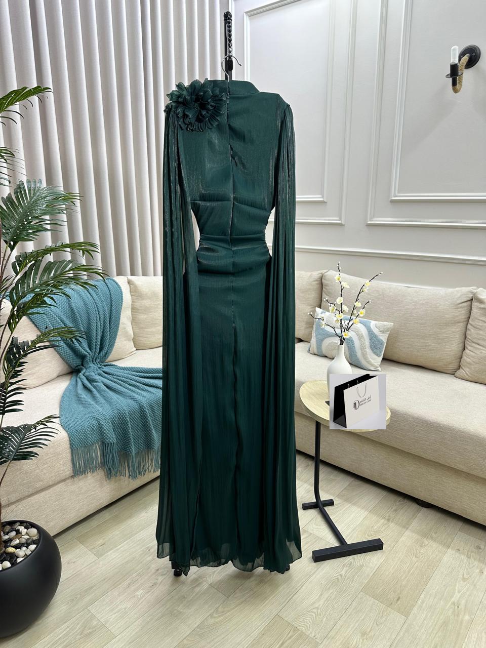 كوني أيقونة الأناقة والتميز مع هذا الفستان السهرة الأخضر الزمردي. يتميز بتصميمه الذي يجمع بين ياقة أنيقة مطوية، وأكمام درامية تنسدل على شكل كيب، وتطريز ورود بارز يزين الصدر. تضفي التنورة الواسعة المصنوعة من قماش البليسيه لمسة من السحر والحركة. هذا الفستان هو الخيار الأمثل للمناسبات الرسمية، وحفلات الزفاف، أو أي احتفال يتطلب إطلالة جذابة وراقية.