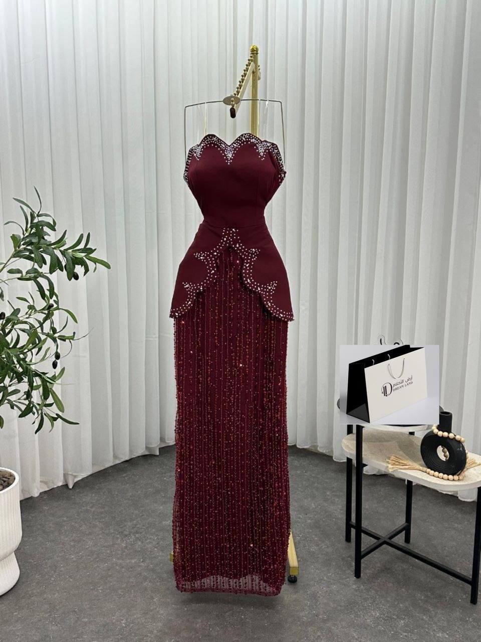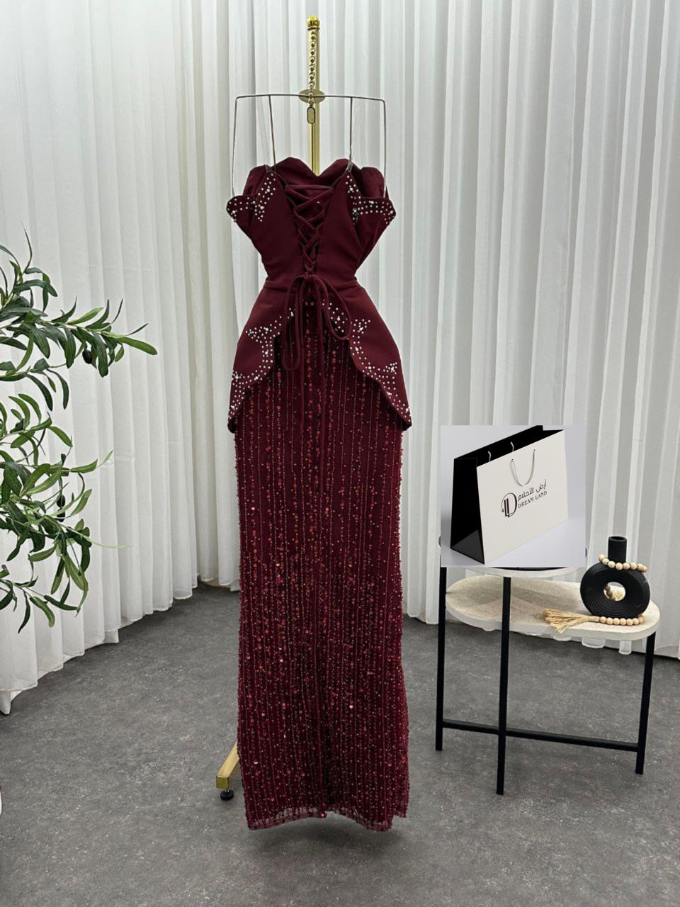 تألقي بإطلالة لا تُنسى مع فستان السهرة العنابي الفاخر هذا. يتميز بتصميم فريد يجمع بين الجزء العلوي ذي قصة الكورساج المحددة للخصر والمزينة بتطريز كريستالي لامع. وتنسدل التنورة المصنوعة من شراريب كريستالية متلألئة، لتضفي على إطلالتك فخامة وحركة آسرة. هذا الفستان هو الخيار الأمثل للمناسبات الرسمية، وحفلات العشاء الفاخرة، ليضمن لك إطلالة استثنائية وجذابة.