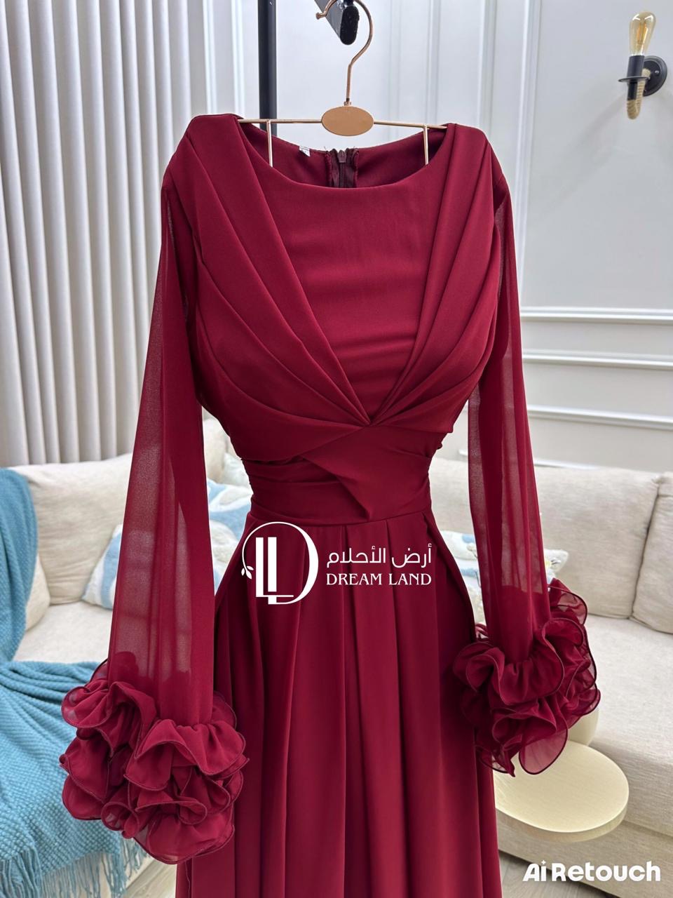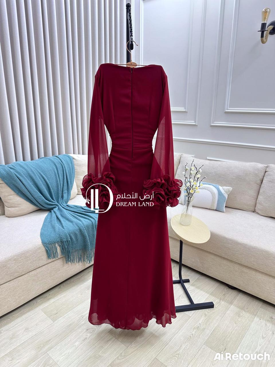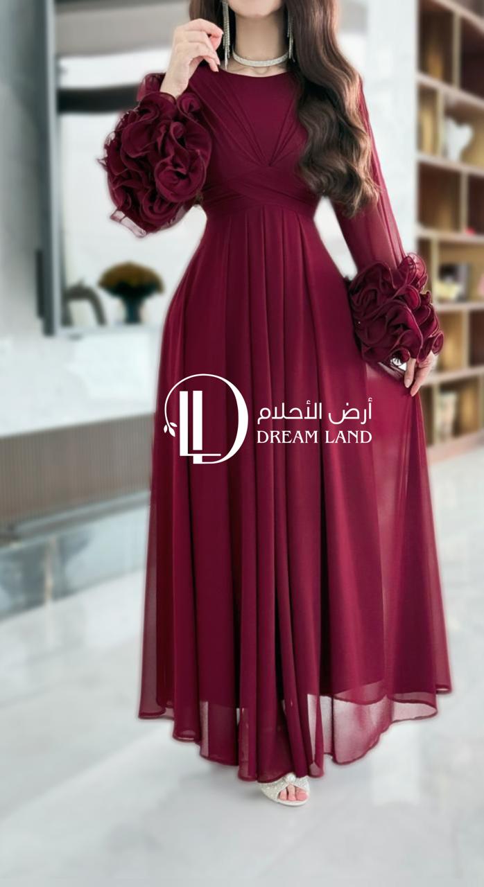 تألقي بإطلالة حالمة وساحرة مع هذا الفستان السهرة. يتميز بتصميمه الذي يجمع بين صدريّة مزمومة تبرز جمال القوام، وأكمام طويلة مزينة بورود منفوخة عند المعصم تضفي لمسة من الأناقة الفريدة. تنسدل التنورة الواسعة من قماش الشيفون الناعم لتمنحك حضوراً أنثوياً وجذاباً. هذا الفستان هو الخيار الأمثل للمناسبات الرسمية، وحفلات الزفاف، أو أي احتفال يتطلب إطلالة جذابة وراقية.