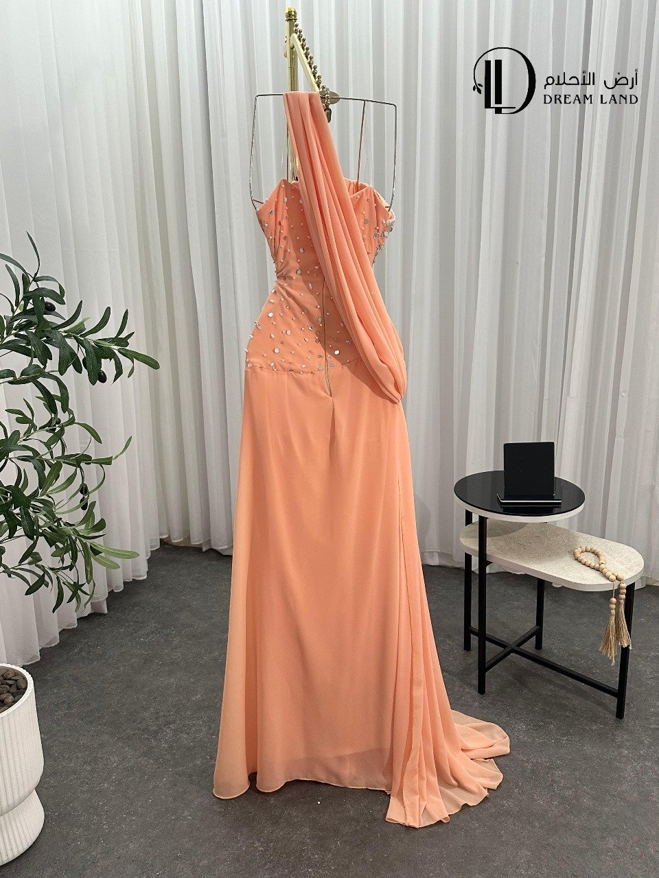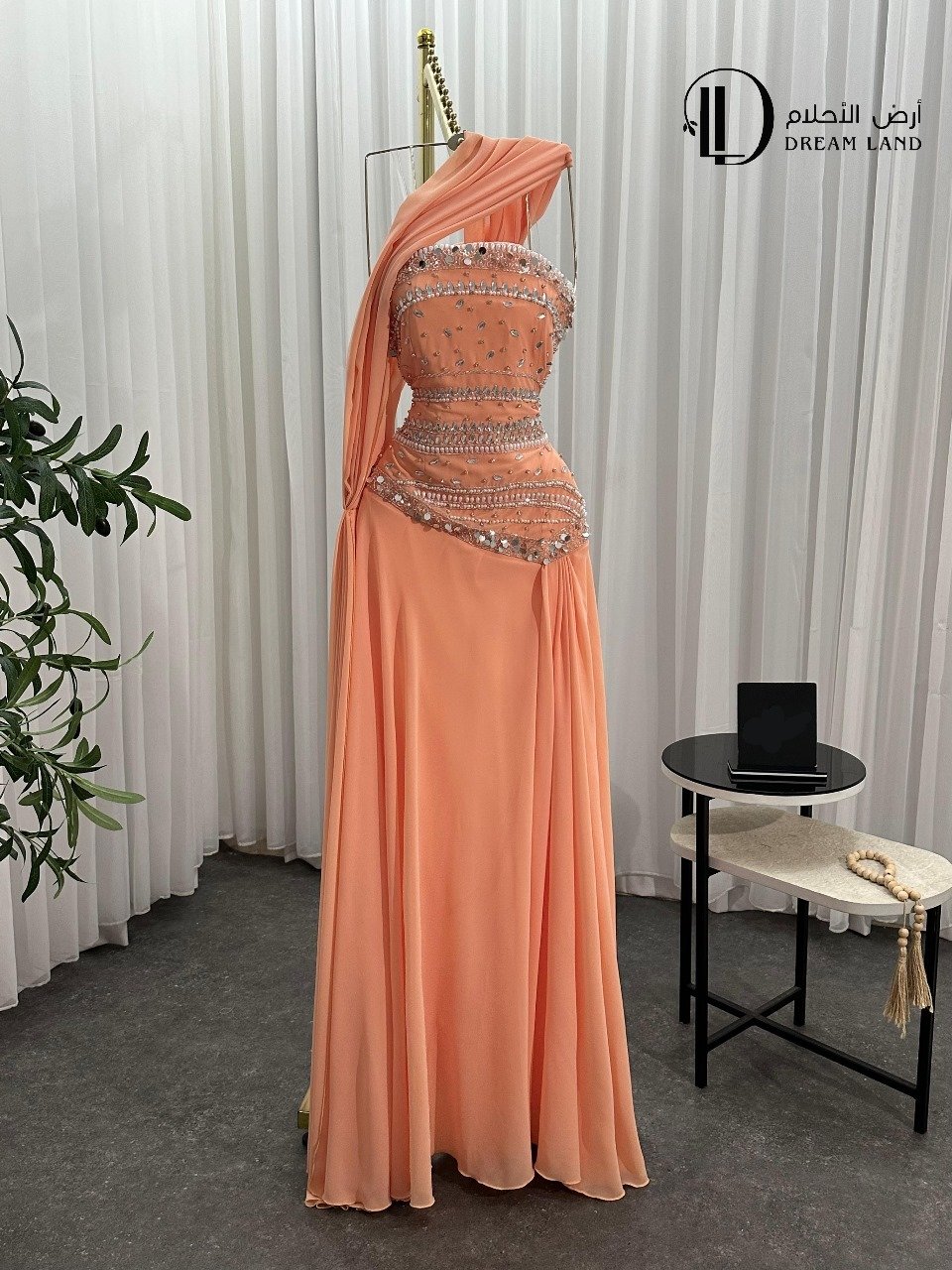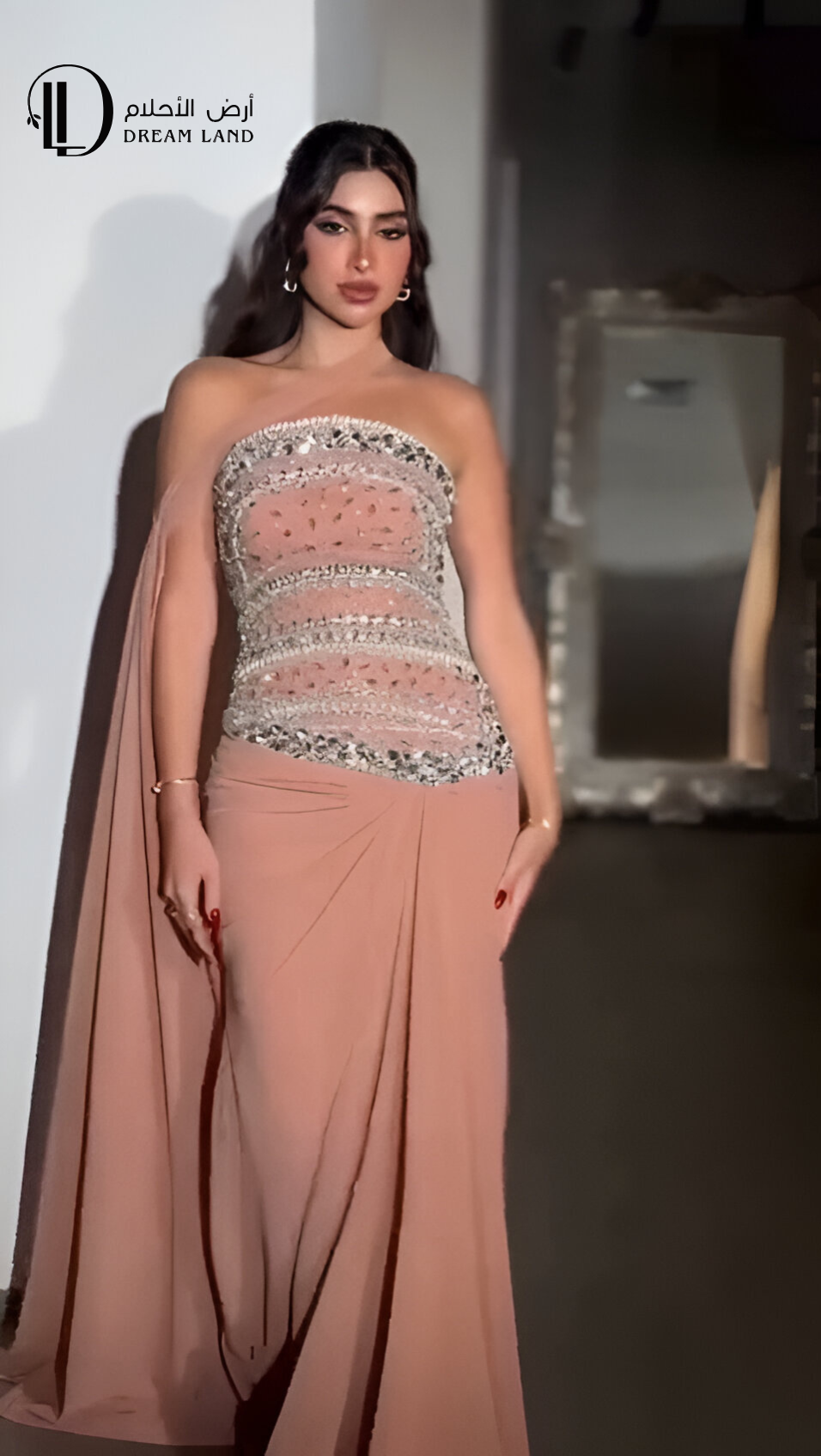أبهريهم في ليلتك الكبيرة مع هذا فستان السهرة البيج الفاخر. مصمم خصيصاً ليمنحكِ إطلالة ملكية، حيث يتميز بلونه البيج الجريء وقصته الانسيابية التي تبرز جمال قوامك. الجزء العلوي مزين بتطريز يدوي على شكل ورود من الكريستال والخرز اللامع، بينما تنسدل التنورة بقصة ذيل السمكة مع طبقات من الكسرات على الجانب لتضيف لمسة من الأنوثة والفخامة. هذا الفستان هو الخيار الأمثل للمناسبات الرسمية، حفلات الزفاف، أو حفلات التخرج، ليجعلكِ محط أنظار الجميع.