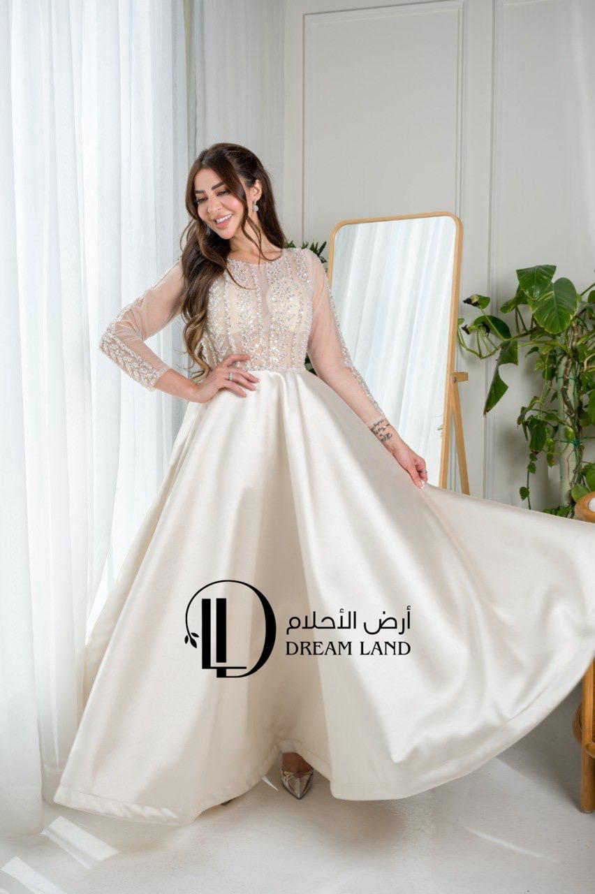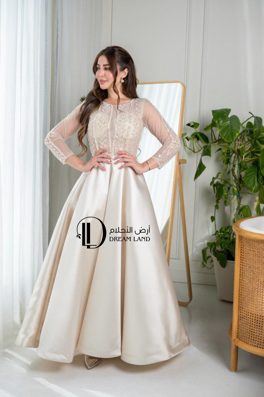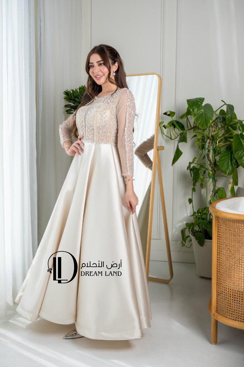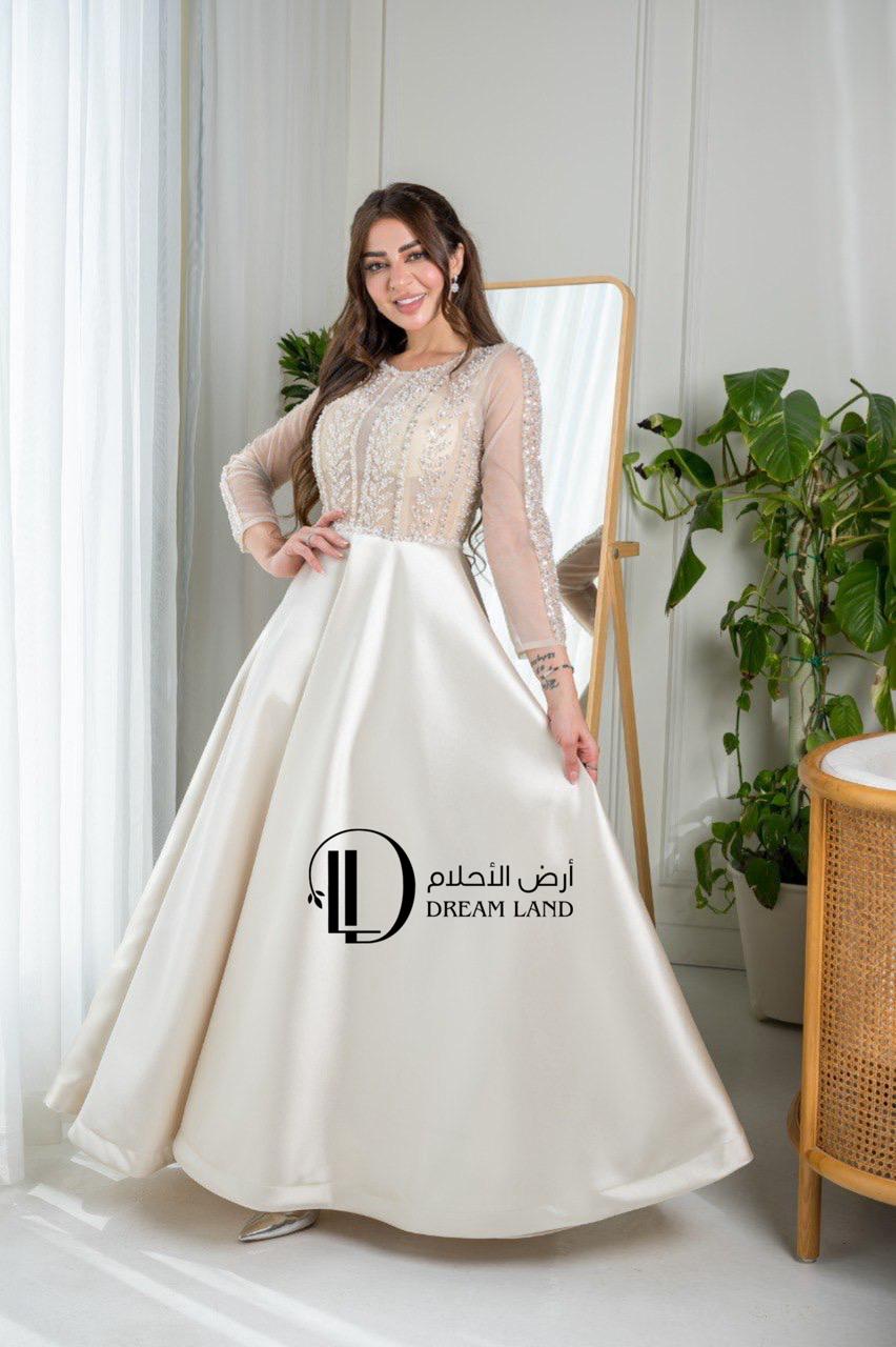 كوني أيقونة الأناقة والتميز مع هذا الفستان السهرة الكريمي الساحر. يتميز بتصميمه الذي يجمع بين صدريّة أنيقة مغطاة بتطريز فاخر يبرز جمال القوام، وأكمام شفافة تضفي لمسة من الرقة والأنوثة. تنسدل التنورة بقصة واسعة من قماش الساتان اللامع لتمنحك حضوراً واثقاً وجذاباً. هذا الفستان هو الخيار الأمثل للمناسبات الرسمية، وحفلات الزفاف، أو أي احتفال يتطلب إطلالة ملكية.