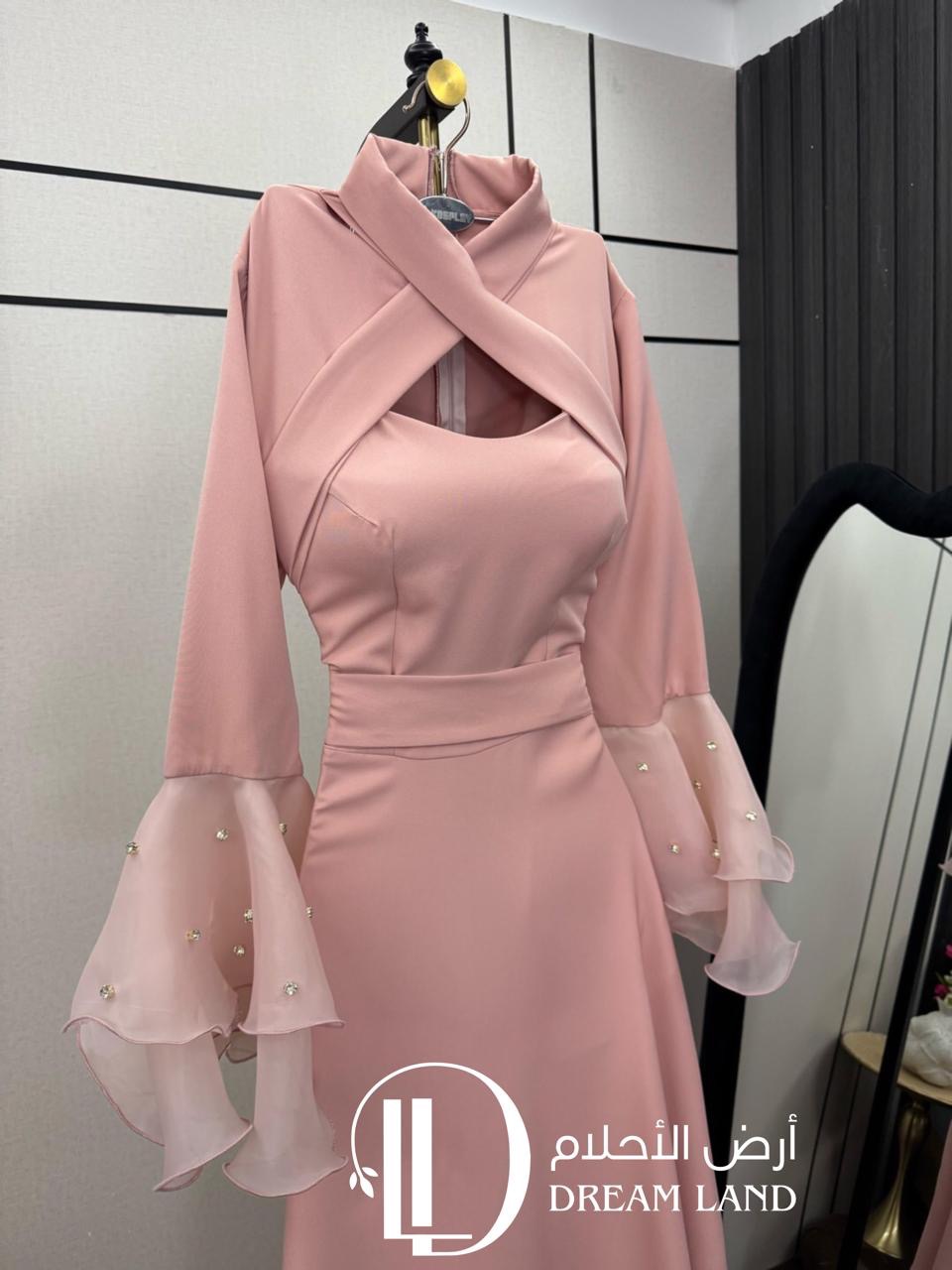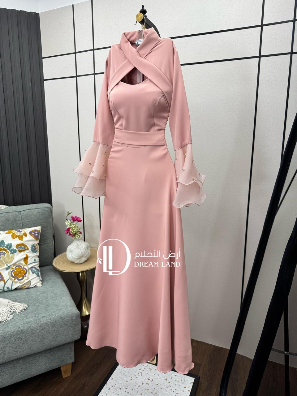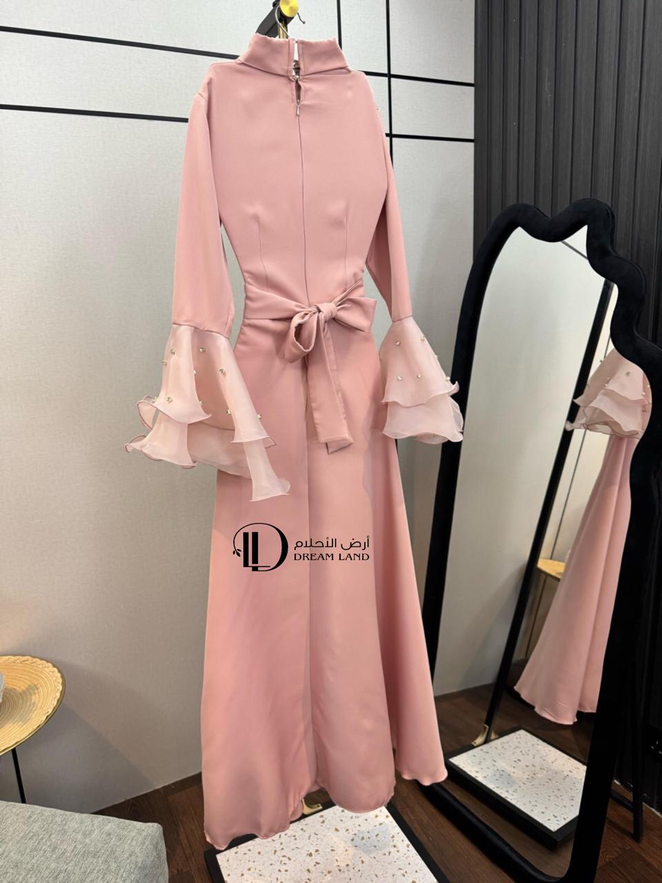 تألقي بإطلالة لا تُنسى مع هذا الفستان السهرة الوردي الساحر. يتميز بتصميمه الذي يجمع بين ياقة ملتفة أنيقة، وخصر محدد برباط يبرز جمال القوام. كما تضفي الأكمام الواسعة التي تزينها طبقات ناعمة لمسة من الأناقة والجمال. هذا الفستان هو الخيار الأمثل للمناسبات الرسمية، وحفلات الغداء، أو أي احتفال يتطلب إطلالة جذابة وراقية.
